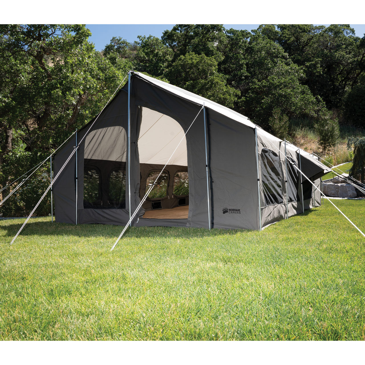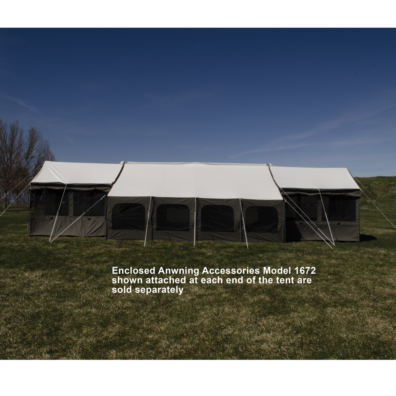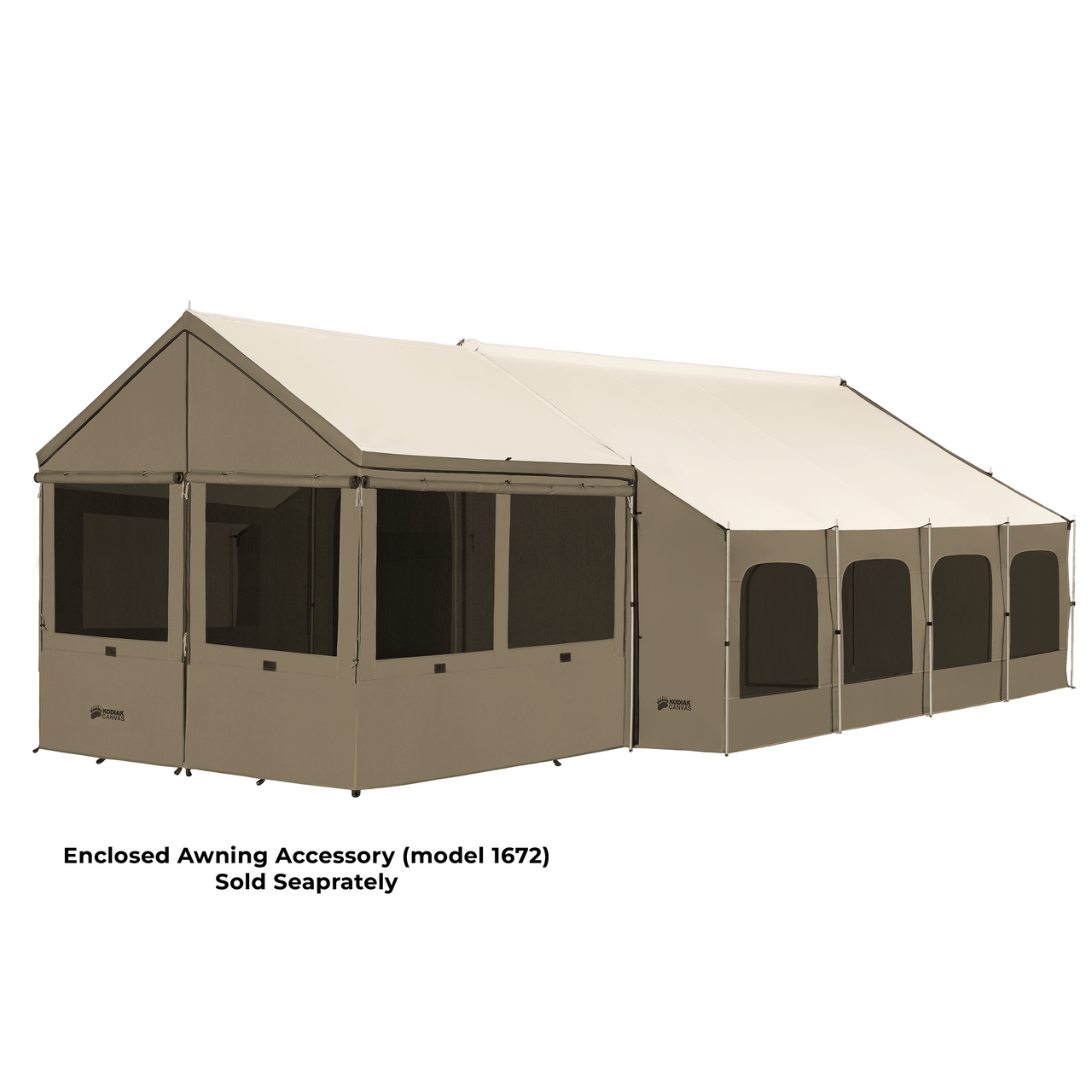The 12x16 Kodiak Canvas Cabin Lodge Stove Ready (SR) tent is the largest of our Cabin Lodge Tent series. It is made with high performance, Hydra-Shield™, 100% cotton duck canvas. The tight weave and silicone finish make this canvas watertight yet breathable, minimizing condensation and mugginess that are common with synthetic tents. The sewn-in floor is a tough 13.5 oz vinyl with welded seams, that keeps water out. The tall ceiling (7.5 ft. at peak) and vertical wall design (4 ft. at sides) provide a roomy interior with stand-up, walk-around comfort. There are 2 large doors at each end of this huge tent - you don't have to crouch to get through them! Nine large windows provide openness, and excellent ventilation. Windows can be opened and closed from inside the tent, and feature no-see-um, screen mesh that keeps the smallest bugs out. A covered storm window and vents can be opened to circulate outside air, even when rainy. The doors and windows feature top-rated YKK zippers. This design, boasting a frame with 1-inch, galvanized, steel tubing, will hold up to strong winds and even snow loads. A stove jack allows for use of a wood burning stove to keep you warm when temperatures drop. When using the tent without a stove, just zip the stove jack cover closed. The 8x8 ft. enclosed awning accessory (model 1672, sold separately) increases the usable space of your tent, and provides a nice area to get out of the weather or store extra gear and wood. These enclosed awning accessories can be added to either or both ends of this tent. A zippered storage bag and hefty, 12-inch, steel tent stakes are included. Requires two adults for setup. Limited lifetime warranty.