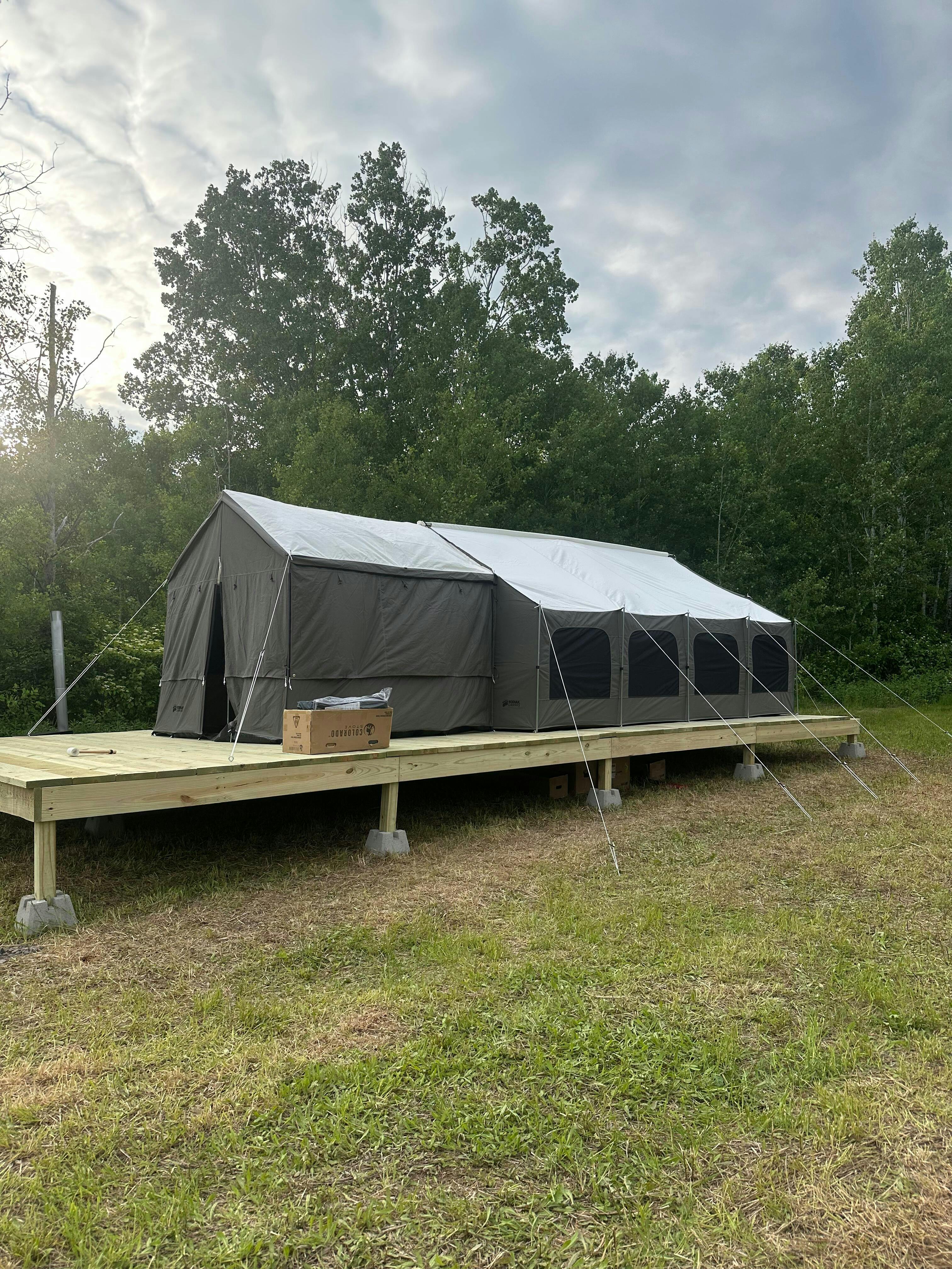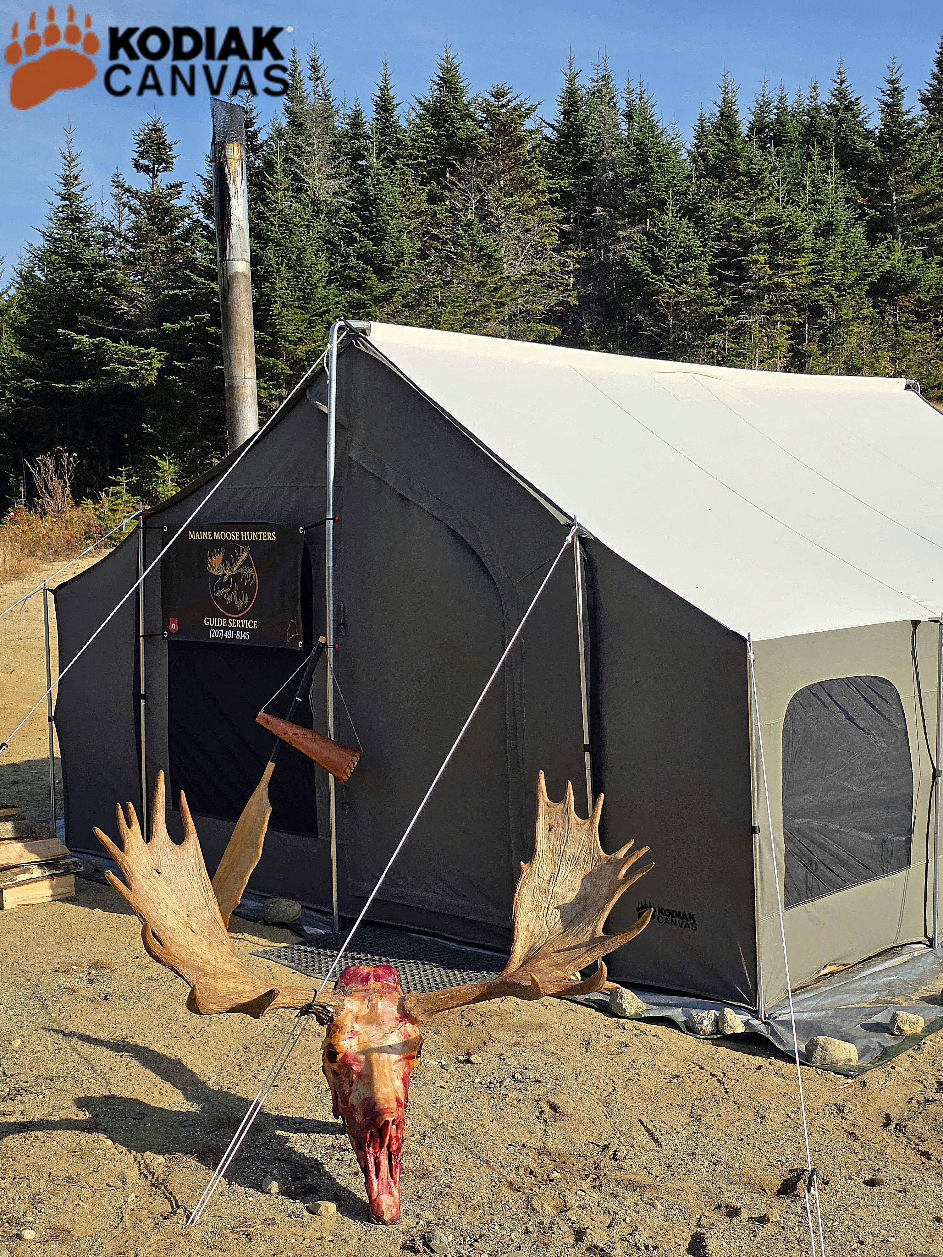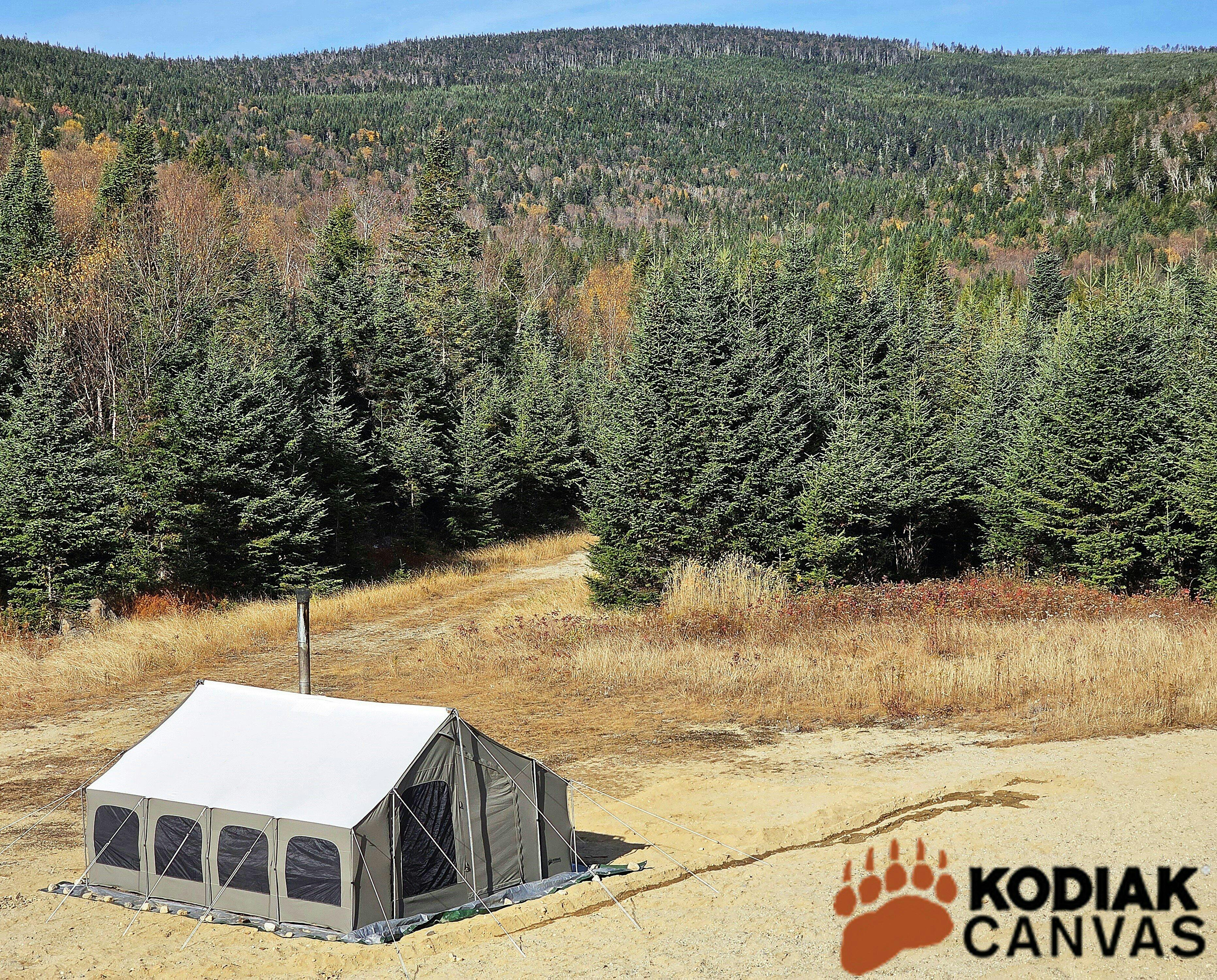 The 12x16 Kodiak Canvas Cabin Lodge Stove Ready (SR) tent is the largest of our Cabin Lodge Tent series. It is made with high performance, Hydra-Shield™, 100% cotton duck canvas. The tight weave and silicone finish make this canvas watertight yet breathable, minimizing condensation and mugginess that are common with synthetic tents. The sewn-in floor is a tough 13.5 oz vinyl with welded seams, that keeps water out. The tall ceiling (7.5 ft. at peak) and vertical wall design (4 ft. at sides) provide a roomy interior with stand-up, walk-around comfort. There are 2 large doors at each end of this huge tent - you don't have to crouch to get through them! Nine large windows provide openness, and excellent ventilation. Windows can be opened and closed from inside the tent, and feature no-see-um, screen mesh that keeps the smallest bugs out. A covered storm window and vents can be opened to circulate outside air, even when rainy. The doors and windows feature top-rated YKK zippers. This design, boasting a frame with 1-inch, galvanized, steel tubing, will hold up to strong winds and even snow loads. A stove jack allows for use of a wood burning stove to keep you warm when temperatures drop. When using the tent without a stove, just zip the stove jack cover closed. The 8x8 ft. enclosed awning accessory (model 1672, sold separately) increases the usable space of your tent, and provides a nice area to get out of the weather or store extra gear and wood. These enclosed awning accessories can be added to either or both ends of this tent. A zippered storage bag and hefty, 12-inch, steel tent stakes are included. Requires two adults for setup. Limited lifetime warranty.