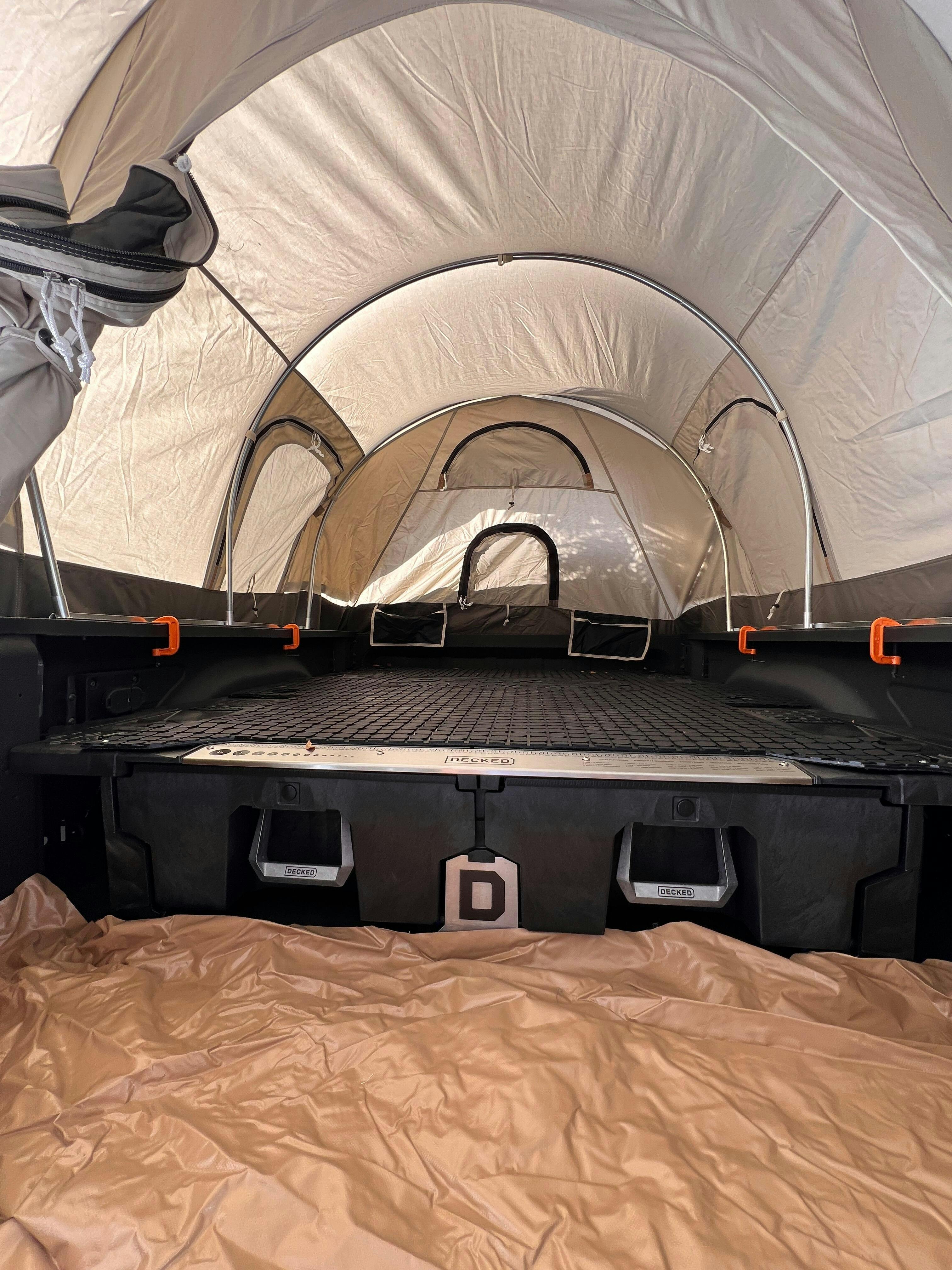 Get the renowned quality of a Kodiak Canvas tent for your pickup truck. Pitch your tent anywhere your truck goes. Keep off the ground, high and dry, and away from the critters. Made with Hydra-Shield™ 100% cotton duck canvas that is durable, watertight, and breathable. Our unique, clamp-on rail design with integrated, 3/4-inch, steel tube frame provides unmatched sturdiness and allows for easy set up. It’s rated for all-season use. Features five windows with no-see-um mesh, for ventilation, light, and openness. Has a cab access window. You can run a power cord from your cab to power your appliances. Features top of the line YKK zippers. Roomy 5 ft. interior ceiling height. Sets up with tailgate down for added space. Convenient gear pockets. Carry bag included.