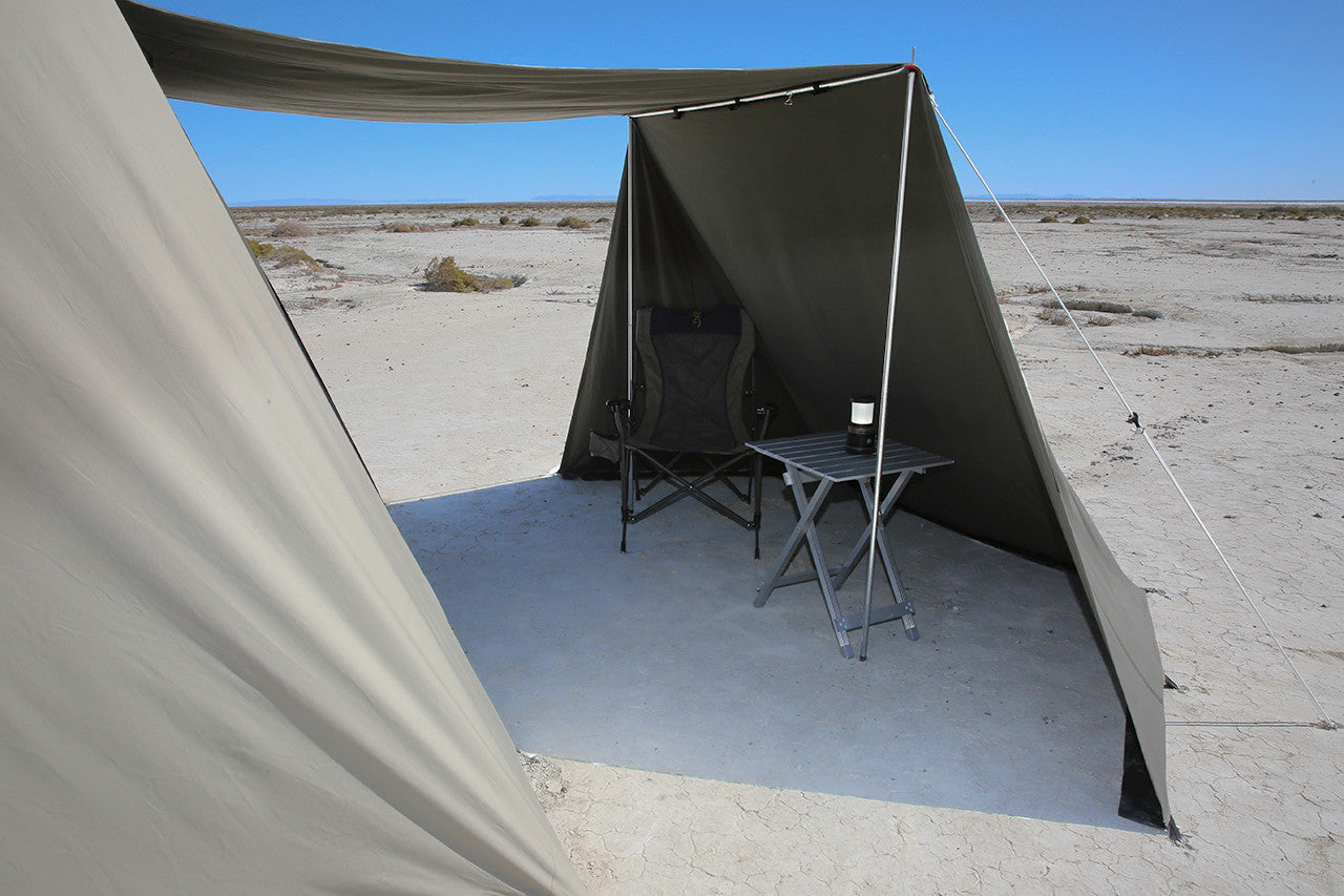 The wing vestibule accessory will enhance your awning’s leisure area by providing additional shade, and protection from wind and rain. It attaches underneath the front of the awning and extends out to the ground. Two side wings provide additional cover on the sides. It creates a nice space to store gear, put some chairs, or keep a pet. It also adds privacy if the front windows are open. Made with the same cotton canvas as our tents. Fits all models of both the Kodiak Canvas 10x10 and 10x14 Flex-Bow tents. The wing vestibule does not fully enclose the awning area. There will be openings on both sides. Note that you will be required to add 2-3 grommets to your awning for optimal fit. Grommet kits (sold separately) are available at most home improvement stores or other online retailers