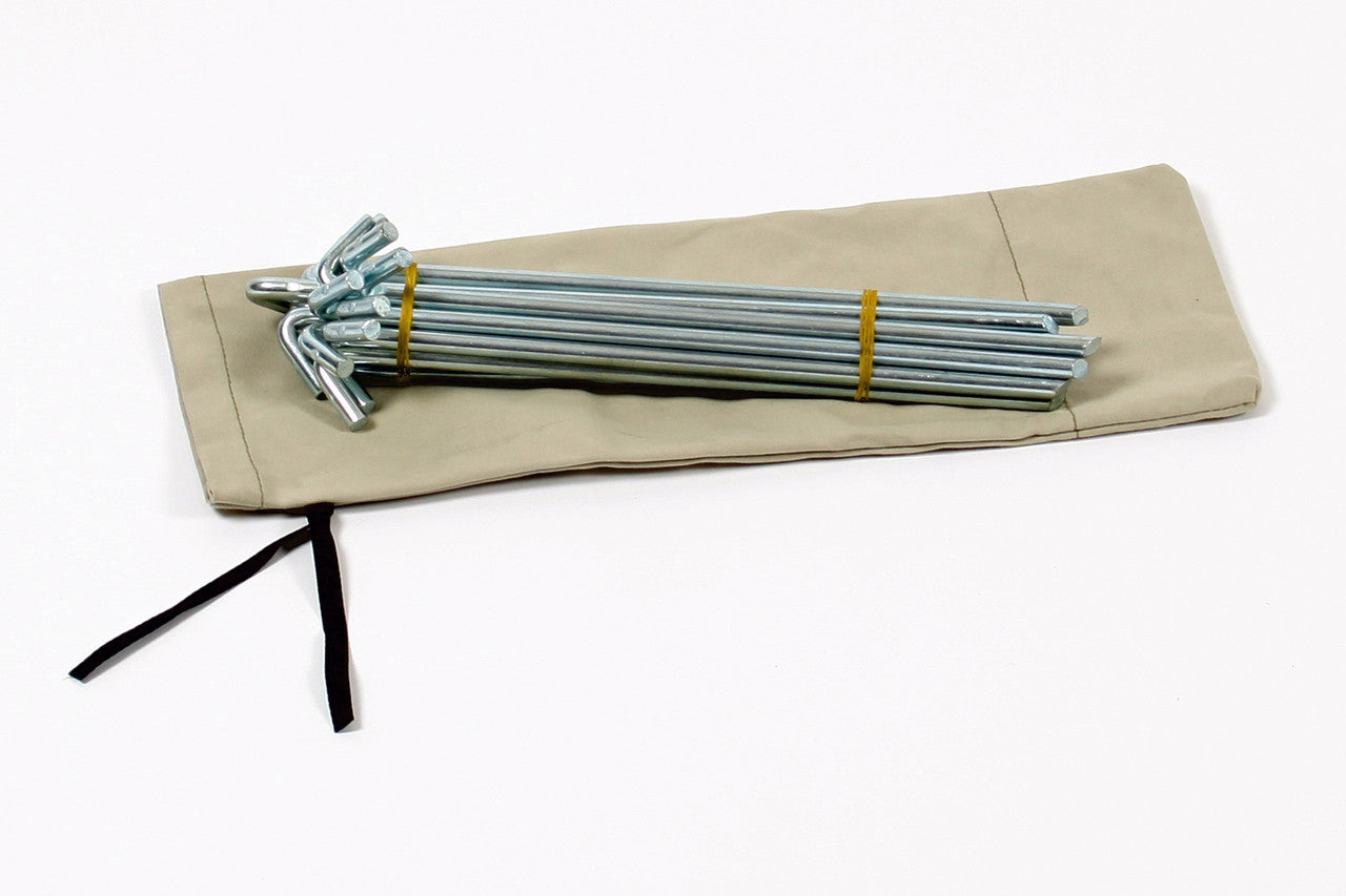 These are the same terrific original stakes that come with our tents. 12 inches long, 3/8 inch diameter, solid steel. Ideal for hard or rocky soil. Not for sandy or soft soil. Carry bag included (color may vary).