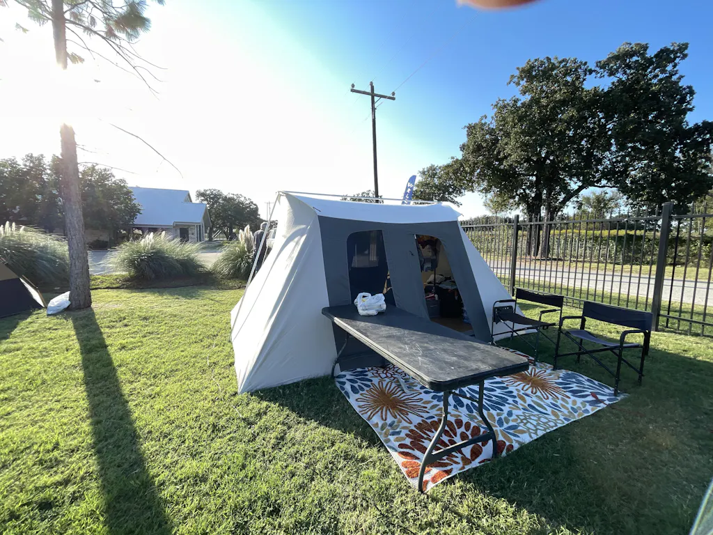 - Large 84x78-inch awning.
