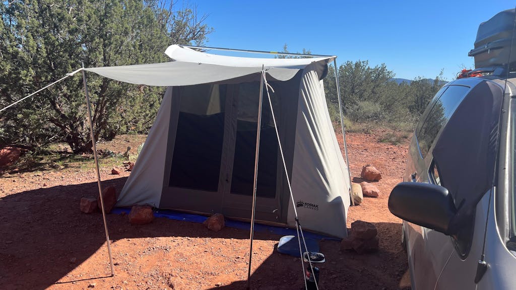 Model 6098. Whether you’re headed to the campground with your family, or elk camp with your hunting buddies, this rugged, all-season tent is well suited for the occasion. Made with premium grade, Hydra-Shield™, 100% cotton duck canvas. The tight weave and silicone finish make the canvas watertight yet breathable, minimizing condensation and mugginess. Go ahead and touch the inside walls during a downpour—this canvas will not wick water. The Flex-Bow frame has tempered, spring steel rods that keep the tent taut, and robust 1-inch steel tube poles that will hold up to fierce winds. The floor material is a puncture resistant, 13.5 oz vinyl with welded seams, that keeps water out. Easy, one-person setup takes only a few minutes after you have it staked out. The steep walls and 6’1” high ceiling provide a roomy interior with stand-up, walk-around comfort. Large front and back doors with top rated #10 YKK zippers give convenient access. Four windows, and two vents allow ample air flow. Windows and vents have no-see-um screen mesh, keeping out the smallest bugs. A customizable gear organizer system offers plenty of places to stow gear. A large awning provides shade and a covered entry. Stainless steel, wire stake loops give superior strength and durability.
