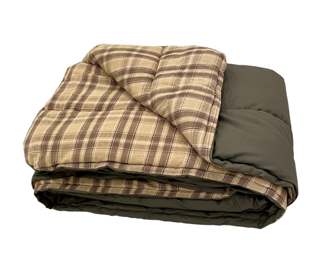 This rugged, yet cozy queen-sized (96x84 in) camping quilt has multiple uses. It can be used as a substitute for a sleeping bag, with room for two. Use it as a quilt for an air mattress, or bedding for your RV or cabin. Use it as an over blanket to boost the warmth of your sleeping bag or take it on a picnic. Made with the same materials as our top of the line Z Top sleeping bags. It is made with a rugged water-resistant canvas shell, and a posh 100% cotton flannel liner. The efficient Factor-4™ insulation is a hollow fiber polyester that is light, fluffy, and very warm. An easy carry, canvas, stuff bag is included. Sweet dreams...