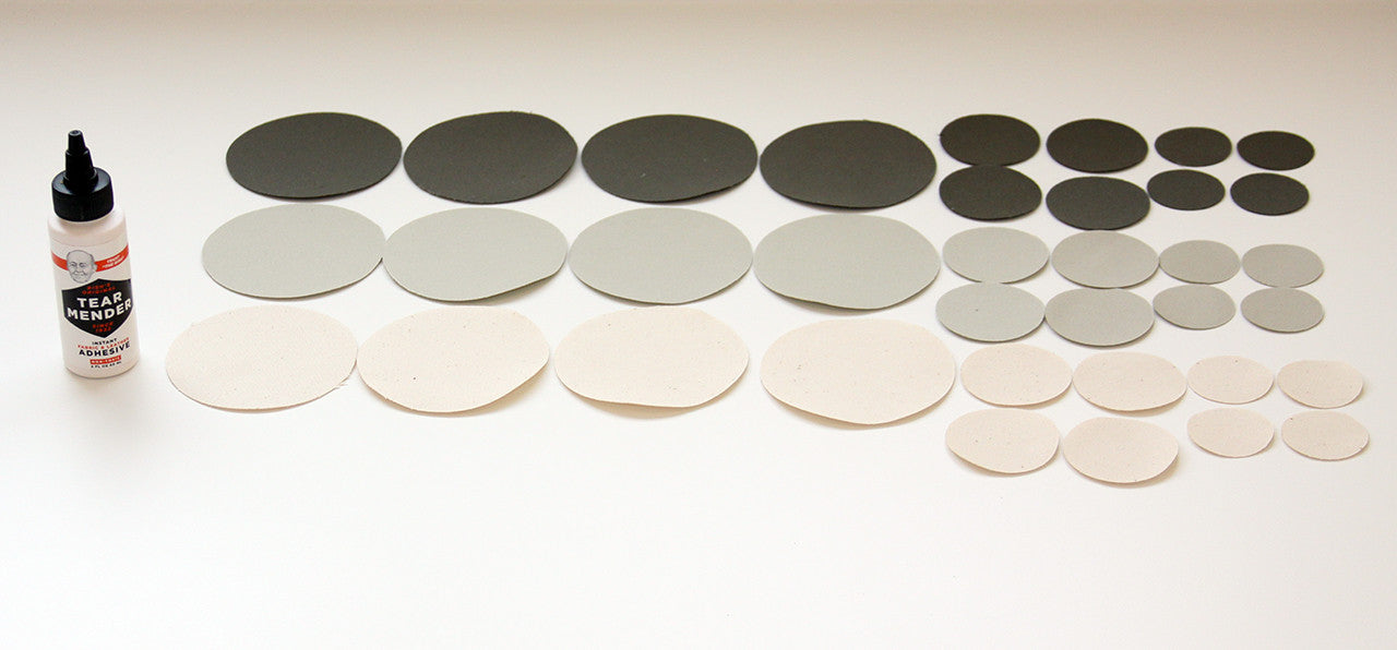Got a hole in your tent? No problem. Patch it up with this handy patch kit. Includes 36 patches, a 2 oz. bottle of fabric glue (Tear Mender), and repair instructions. You get four patches of each size and color (36 total). Sizes: 1.5, 2, and 3.5 inches. Colors: Tan, brown, and natural. Please note that the color and canvas match current production color and fabric. Dye lots vary, and some fading will occur to fabrics exposed to sunlight. In other words, your patch kit will more than likely be a shade off.